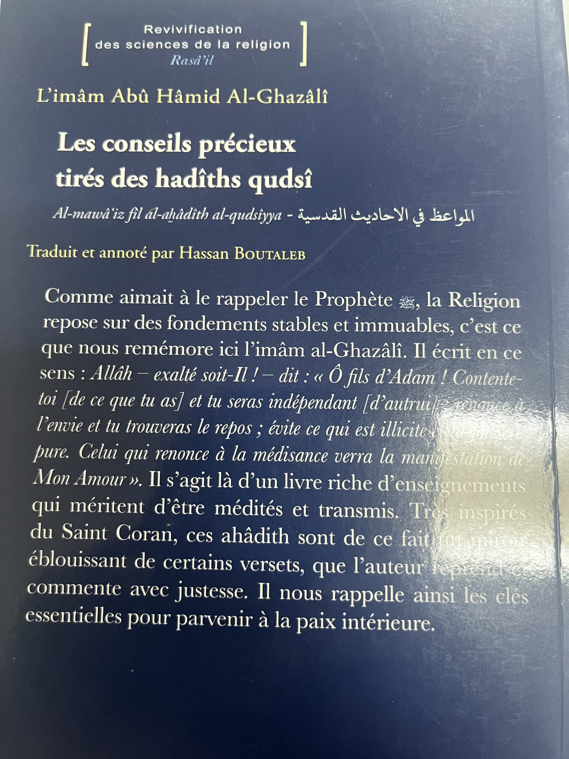 Comme aimait à le rappeler le Prophète es, la Religion repose sur des fondements stables et immuables, c’est ce que nous remémore ici l’imâm al-Ghazâli. Il écrit en ce sens : Allâh – exalté soit-Il! – dit : « Ô fils d’Adam ! Contente-toi [de ce que tu as) et tu seras indépendant [d’autrui: l’envie el tu trouveras le repos ; évite ce qui est illicite et sera pure. Celui qui renonce à la médisance verra la manifestation de Mon Amour ». Il s’agit là d’un livre riche d’enseignements qui méritent d’être médités et transmis. Tres inspirés du Saint Coran, ces ahâdith sont de ce fait miroir éblouissant de certains versets, que l’auteur reprend et commente avec justesse. Il nous rappelle ainsi les clés essentielles pour parvenir à la paix intérieure.